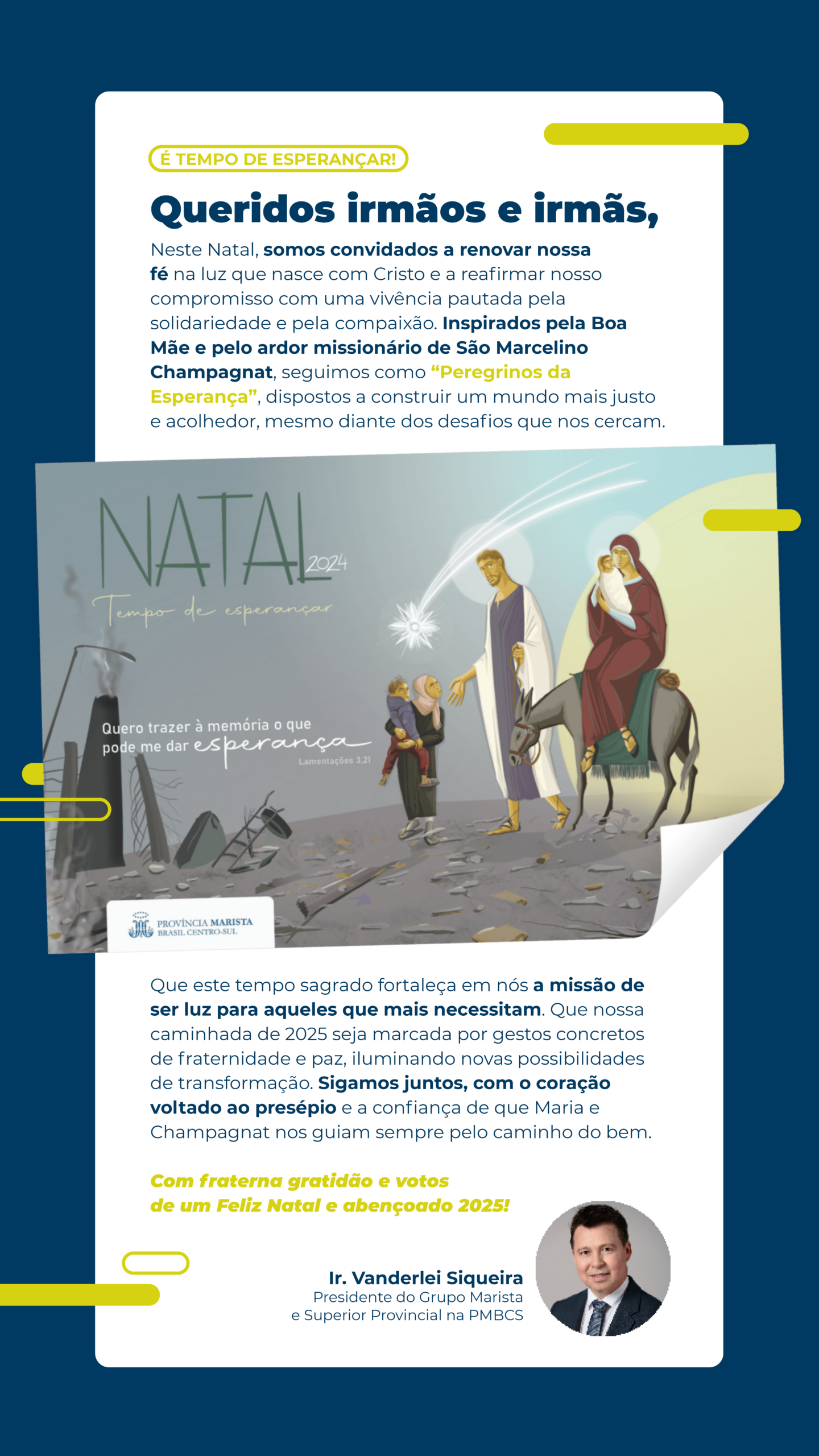 Neste Natal, somos convidados a renovar nossa fé na luz que nasce com Cristo e a reafirmar nosso compromisso com uma vivência pautada pela solidariedade e pela compaixão. Inspirados pela Boa Mãe e pelo ardor missionário de São Marcelino Champagnat, seguimos como “Peregrinos da Esperança”, dispostos a construir um mundo mais justo e acolhedor, mesmo diante dos desafios que nos cercam.